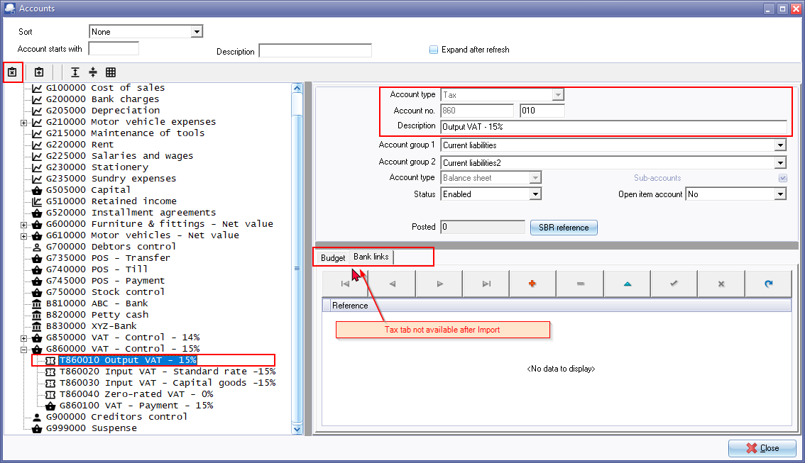 Blocked accounts - If accounts status is set to disabled, these accounts will be imported. Note the status of disabled accounts is set to enabled. For example, if you have changed the Tax rates, and do not wish to use these old accounts, you may delete these accounts or disable them. The Reporting groups for Account groups 1 and Account group 2, will also be imported in the Setup Groups. |