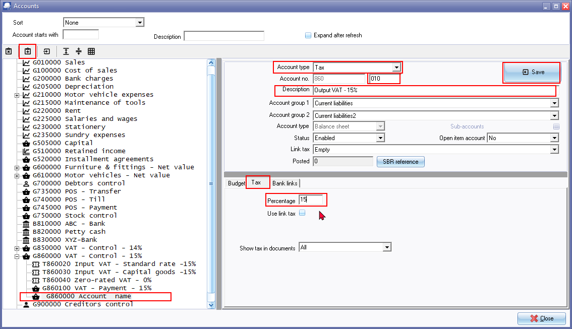 Select the Tax control account (e.g. VAT - Control - Output VAT - 15%) (main account).