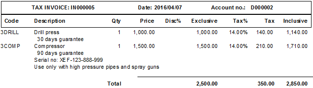 In TurboCASH3, TurboCASH4 and TurboCASH5, osFinancials4, and TurboCASH5.2 (Build 299) the F9:Comments was always, by default, inserted after a selected stock item. After TurboCASH5.2 (build 300) onwards, the F9:Comments is inserted before a selected stock item. In TurboCASH5.2 (build 398) an option "Append notes after item" (Setup → Documents setup (Setup ribbon)) is added to set the preference if Comments should be added before, or after, a selected stock item when processing documents and printing comments on layout files. The default "Append notes after item" setting is not selected. It will display on document lines and document layout files as follows: