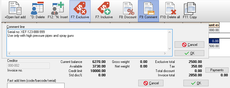 - Enter the comment for the stock item, or transaction, and click on the OK button. The comment will be transferred into the selected line or row and will display as follows on the Document entry screen: