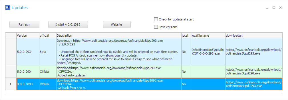 The Update option will list all the installation files available for download. By default, the Update will be launched when starting osFinancials. To disable the check for update at start, select this field and remove the tick.