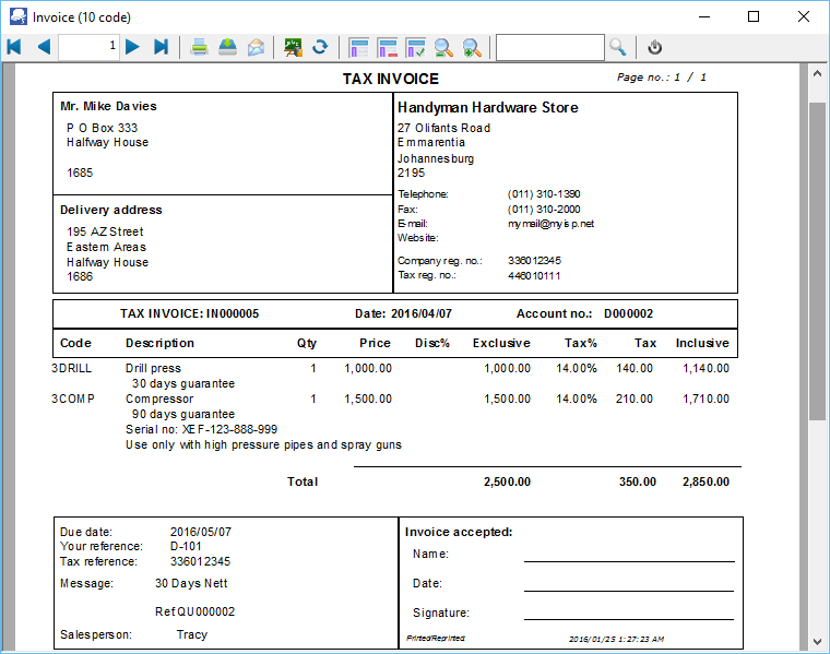 This example is based on the Invoice (10 code). You may also select the following available order layout files: - Invoice (15 code) - Invoice (no codes) - Invoice A4 (10 code) - Invoice A4 (15 code) - Invoice A4 (no codes) - Invoice A4 Plain (10 code) - Invoice A4 Plain (15 code) - Invoice A4 Plain (no codes) |