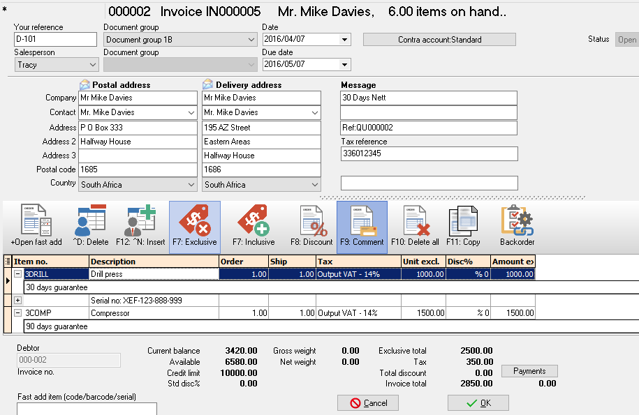 - Fast add item (code / barcode / serial) - Enter the stock code, barcode or serial number. Press enter to add the item to the document lines.