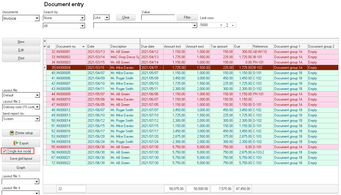 By default, the "Single line mode" option is selected (ticked). The details for each of the documents in the list will display in a single line. If you select this option, a column header "Use your mouse to pull a column here to group on that column" will be not be displayed on which the similar data in columns can be grouped.