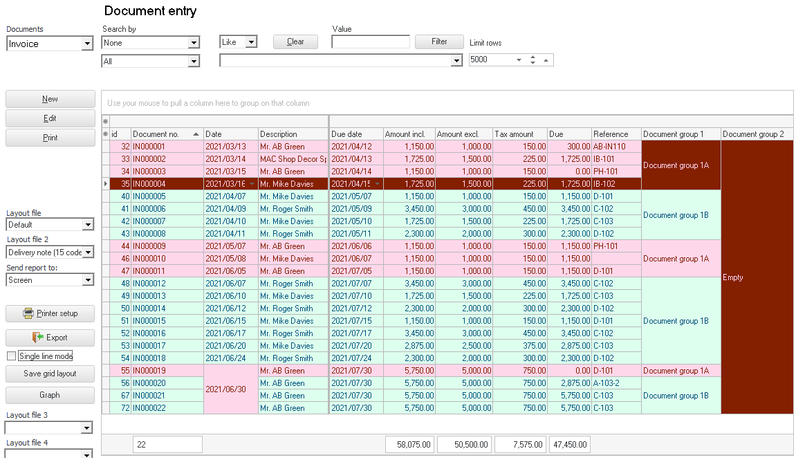 All similar data in columns will be displayed once, e.g. Dates, Document groups, Salespersons, etc.