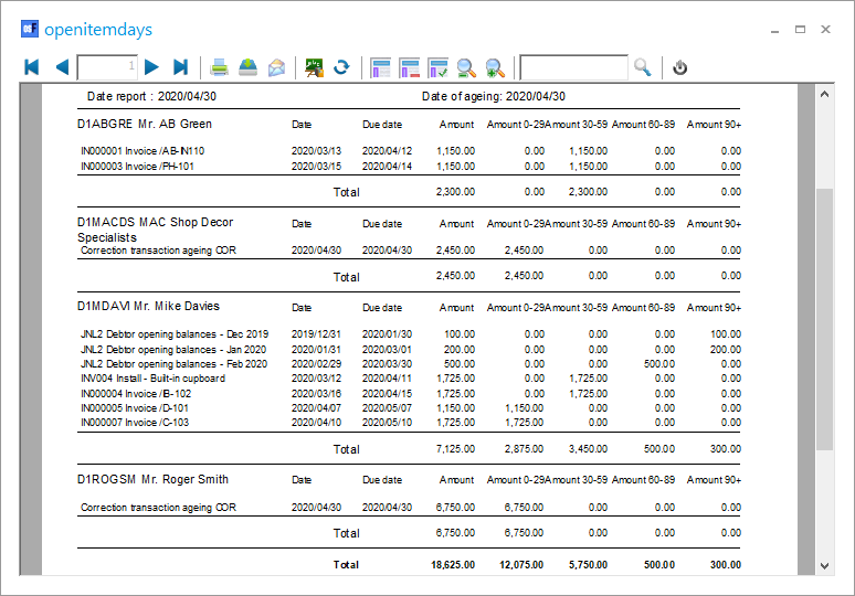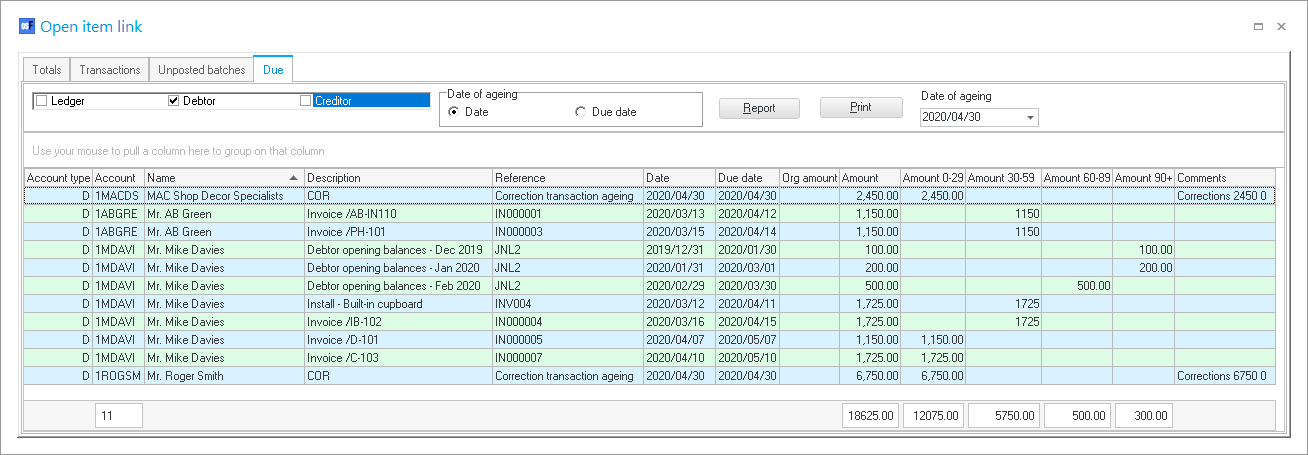 The Due tab will list all transactions for all open item accounts (i.e. ledger, debtors and creditors), which is set as open item accounts.