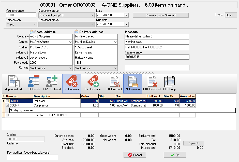 - Fast add item (code / barcode / serial) - Enter the stock code, barcode or serial number. Press enter to add the item to the document lines.