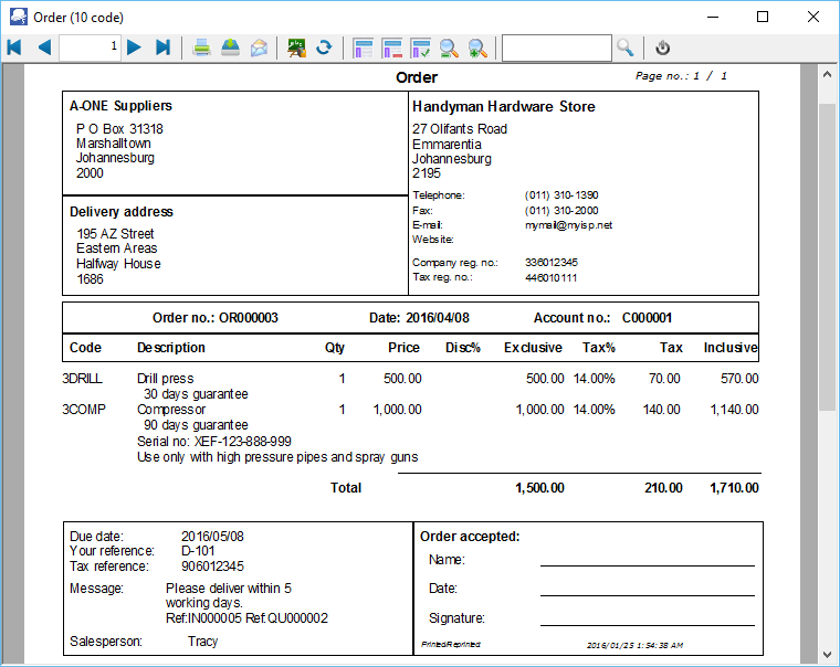 This example is based on the Order (10 code). You may also select the following available order layout files: - Order (15 code) - Order (no codes) - Order A4 (10 code) - Order A4 (15 code) - Order A4 (no codes) - Order A4 Plain (10 code) - Order A4 Plain (15 code) - Order A4 Plain (no codes) |