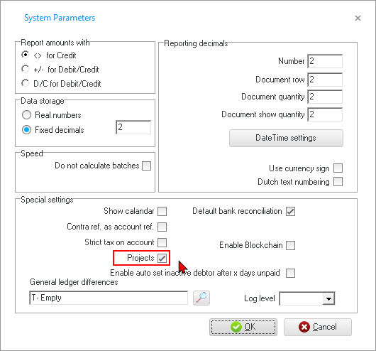 - Select (tick) the “Projects” option in the “Special settings” section of the screen.