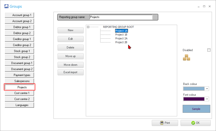 You may set the background and font colours for your projects, if necessary. In addition to this, you may create and set colours for up to 2 reporting groups for “Stock group 1”, “Stock group 2” and / or “Document group 1”, “ Document group 2”. |