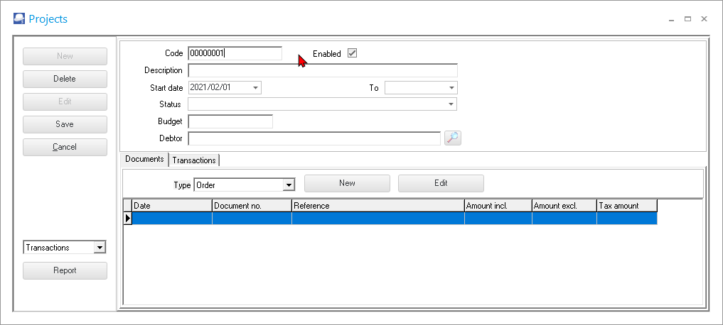 If the default debtor (customer / client) account is selected, purchase documents (Purchases, Supplier returns and Orders) and sales documents (Invoices, Credit notes and Quotes) for the Project can only be processed for the default debtor (customer / client) account. |