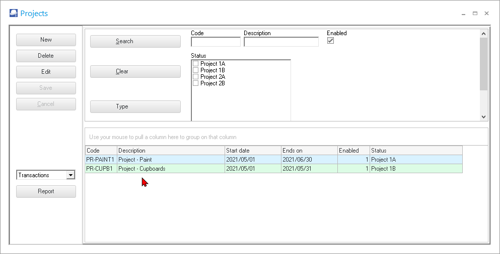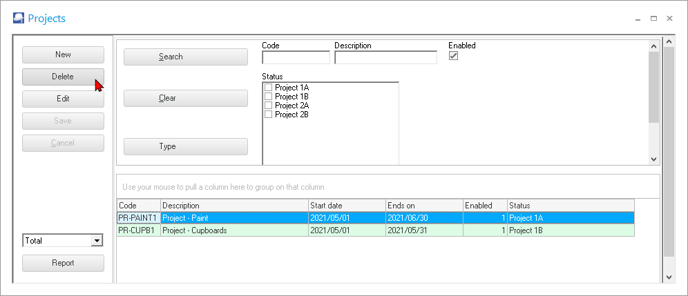 - Search / Filter – Search for a project by project code or project description. You may also filter by selecting specific project groups.