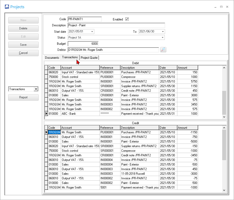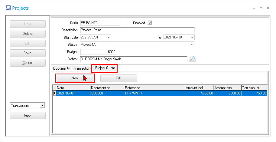 The selected project screen allows you to edit a project details and to manage a selected project on the Documents, Transactions and Project Quotes tabs.