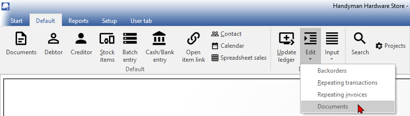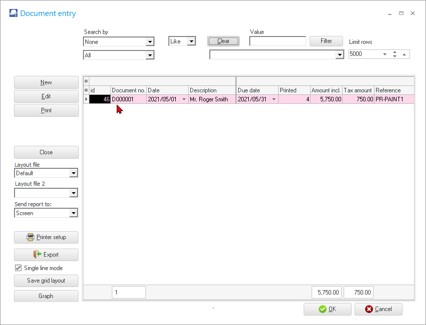 - Edit – Opens the selected document on the list in the “Document entry” screen.