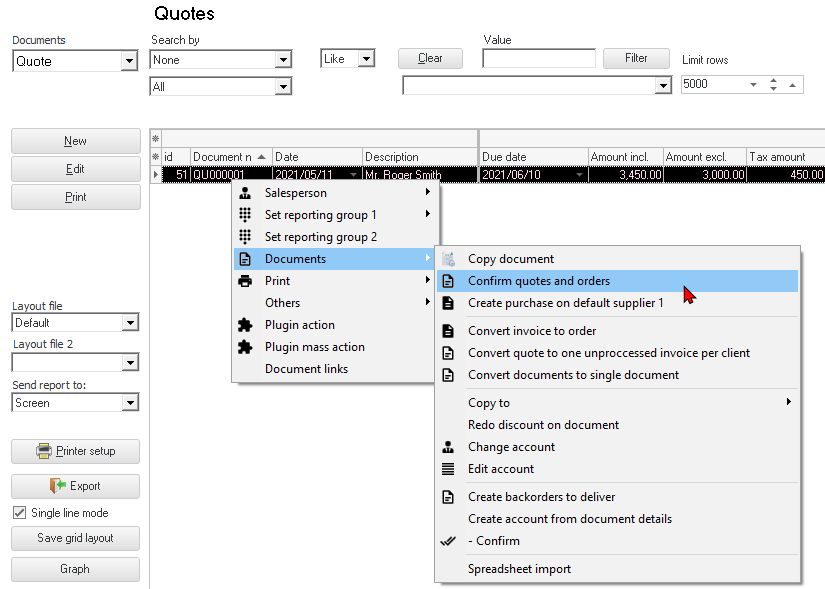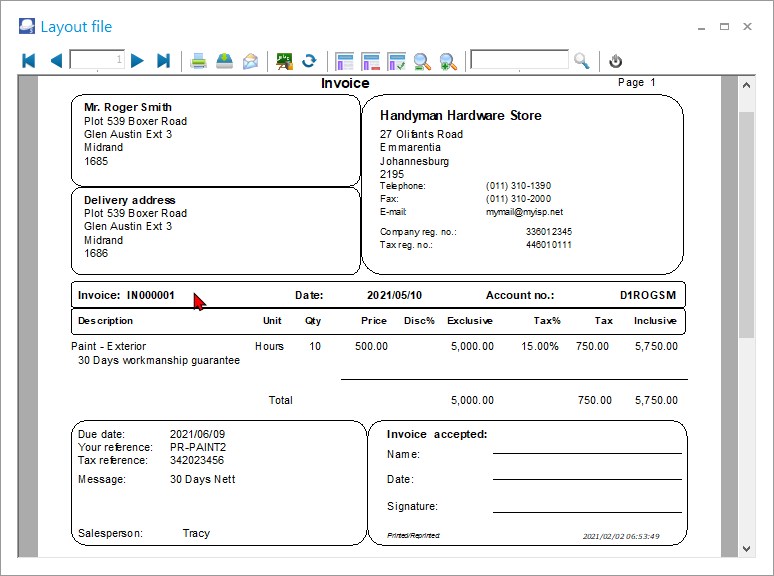 If the document is printed in the incorrect layout file, for example, a credit note is printed in the invoice layout file, open the selected document from the list. When the document is closed it will print in the correct layout file for the document type. |