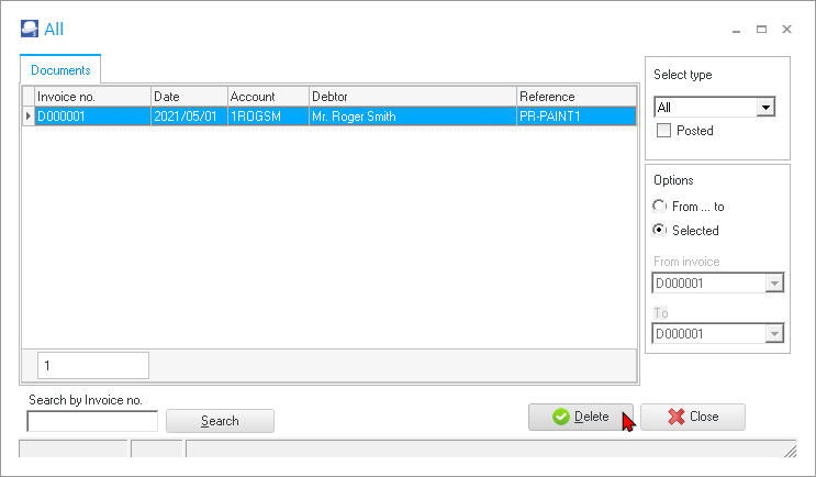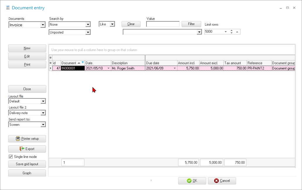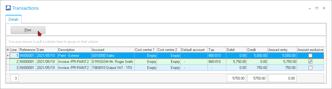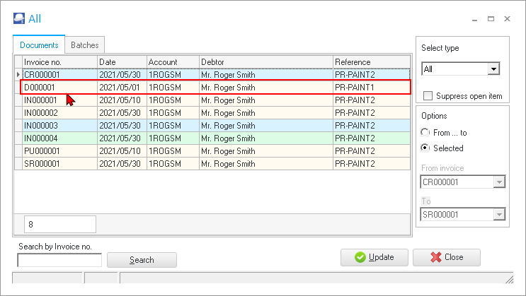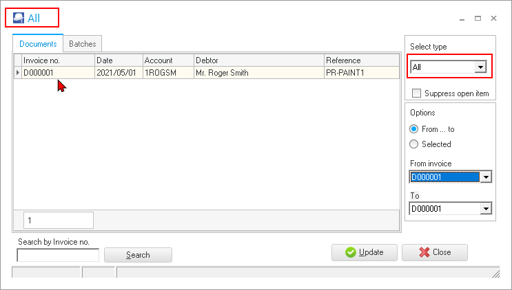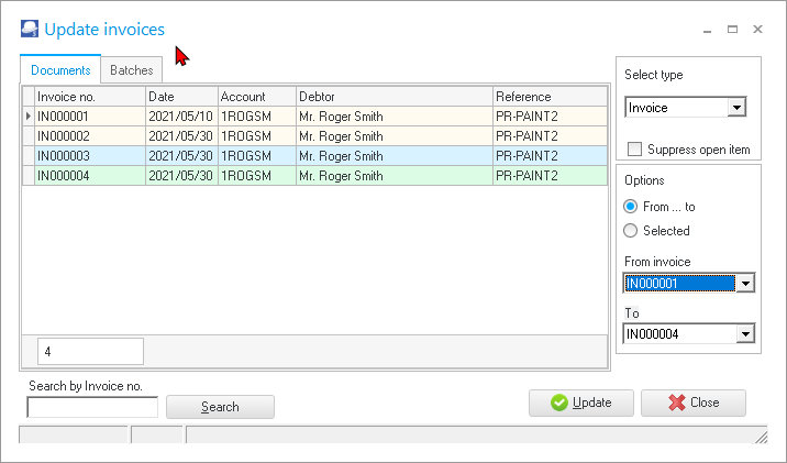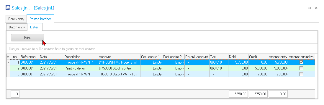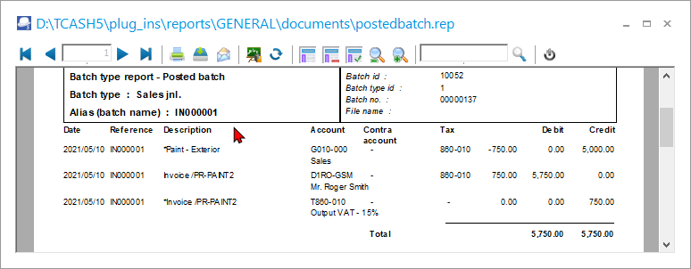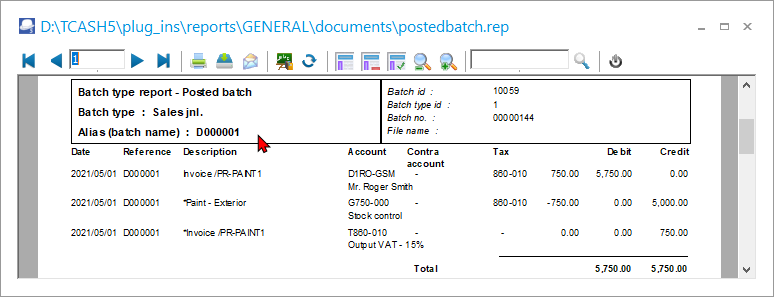 The transactions can be viewed and printed in the “Sales jnl.” batch on the “Batch entry” screen – Posted batches tab. The “Sales jnl.” is linked to the Invoice document type (Documents setup (Setup ribbon). |