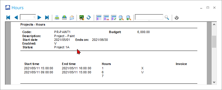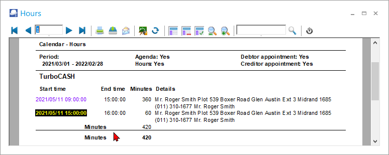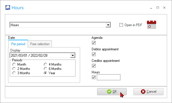 - Hours – Prints the Hours report for documents created / edited for the Hours event and Invoices created for debtor (customer / client) appointments.