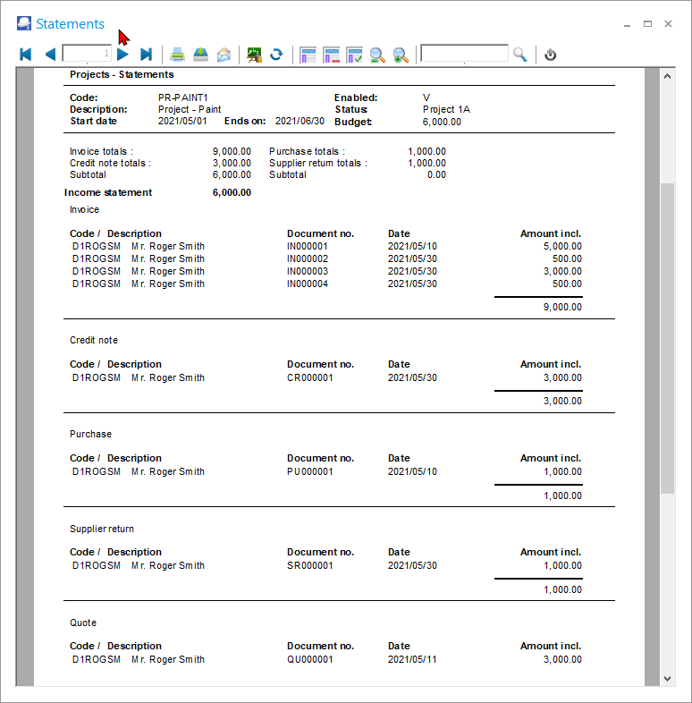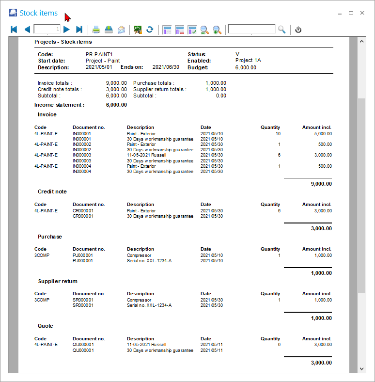 The Documents tab, lists all the document types; i.e. purchase documents (Purchases, Supplier returns and Orders) as well as sales documents (Invoices, Credit notes and Quotes) which are processed for the selected Project.