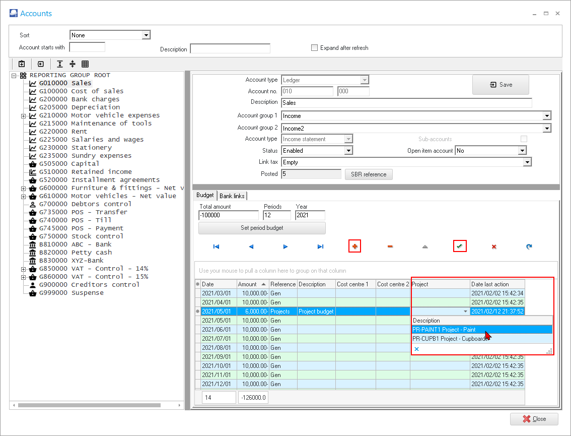Budget figures for projects may also be added for selected accounts in Accounts (Setup ribbon). |