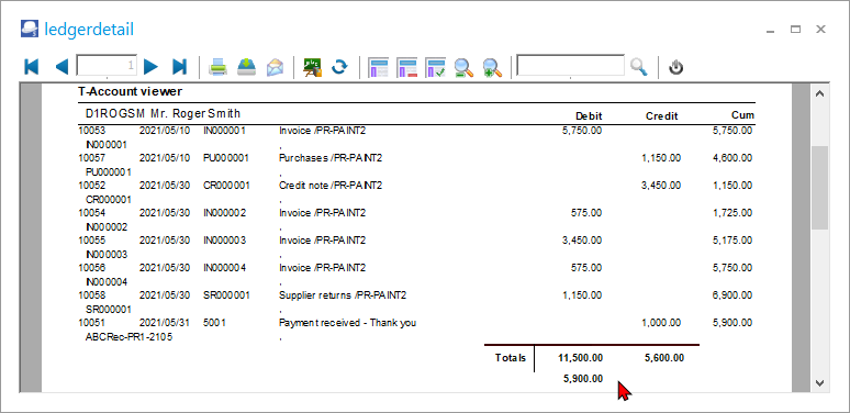 - Credit – Credit notes and Purchase documents will be listed for the Debtor or Creditor account. The contra accounts (e.g. Sales and Stock control and Tax accounts) will be listed in the “Debit” credit section.