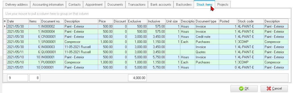 This tab will list all the posted as well as unposted sales documents (i.e. invoices, credit notes and quotes) and purchase documents (i.e. purchases, supplier returns and orders) for the selected debtor (customer / client) account.
