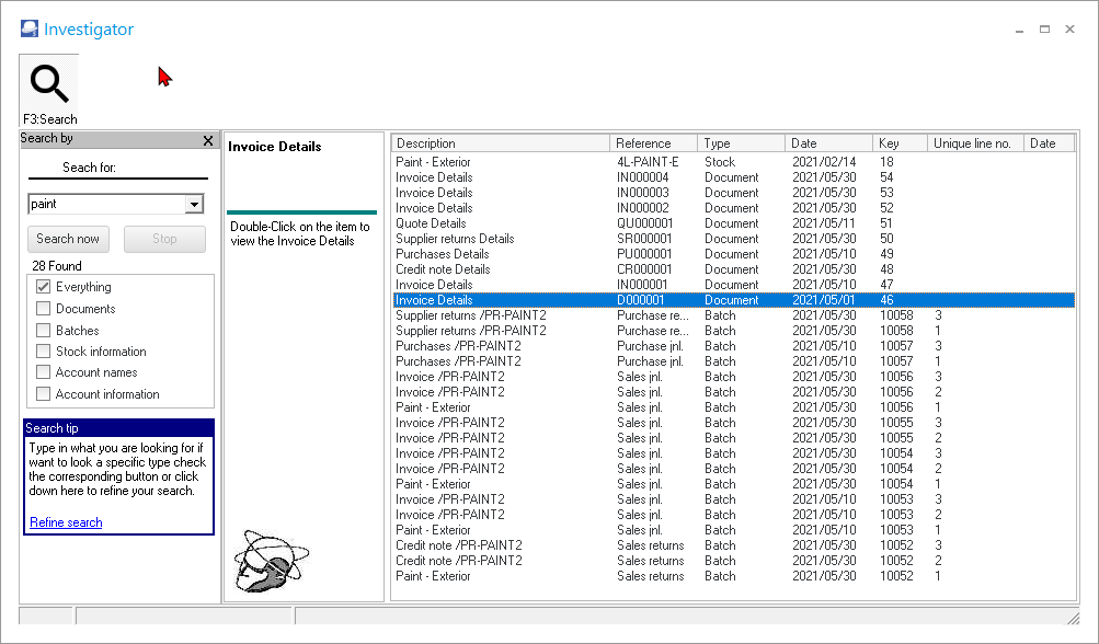 SERIAL TRACKING - If you have entered a serial number of a product (stock item) as a comment on your sales documents (Invoices, Credit notes and / or Quotes) and / or on purchase documents (Purchases, Supplier returns and / or Orders), you may enter the serial number in the “Search For:” field. If you click on the Search now button, the Documents will be listed. You may then double-click on the selected document to preview the document. |