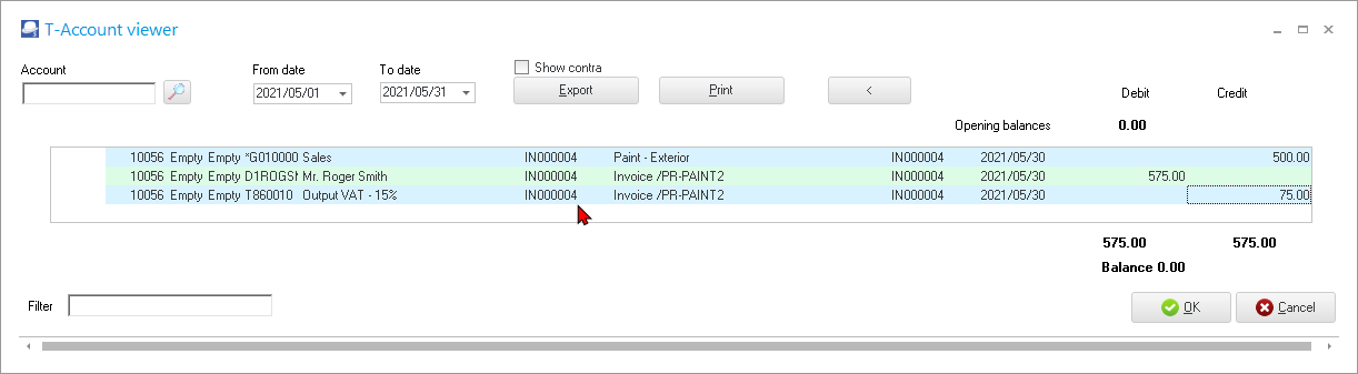- Debit – Invoices and Supplier return documents will be listed for the Debtor or Creditor account. The contra accounts (e.g. Sales and Stock control and Tax accounts) will be listed in the “Credit” credit section.