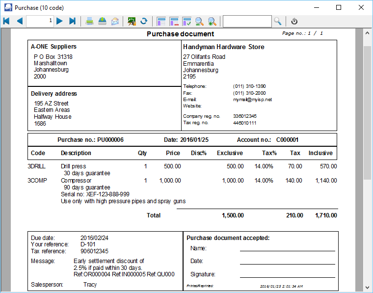 This example is based on the Purchase (10 code). You may also select the following available order layout files: - Purchase (15 code) - Purchase (no codes) - Purchase A4 (10 code) - Purchase A4 (15 code) - Purchase A4 (no codes) - Purchase A4 Plain (10 code) - Purchase A4 Plain (15 code) - Purchase A4 Plain (no codes) |