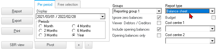 An example of the "Balance sheet - Reporting group 1" report type, in the "Ledger analyser" screen is displayed as follows: