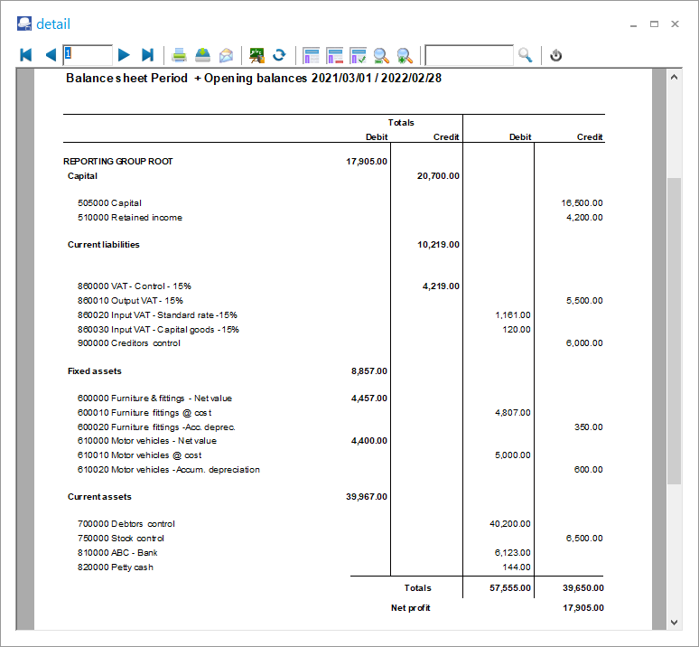 Click on the Print button. An example of the printed "Balance sheet - Reporting group 1", is displayed as follows: