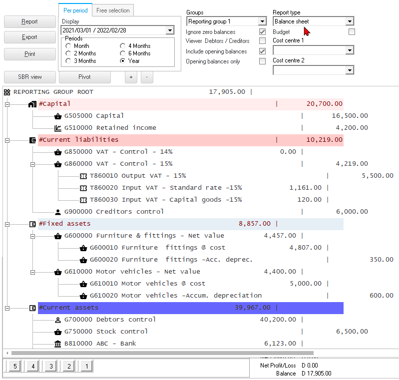 - Reporting group 1 - List all accounts according to the reporting group (e.g. Capital + Current Liabilities + Fixed Assets + Current Assets)