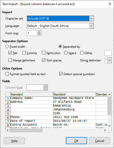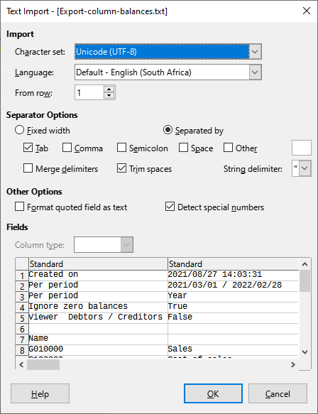 - The "Text Import" screen of your favourite spreadsheet program (e.g. "Microsoft Excel, LibreOffice Calc, OpenOffice Calc, Ultra Office", etc.), will be launched. In this example "LibreOfficeCalc" is used.