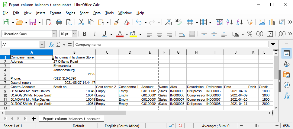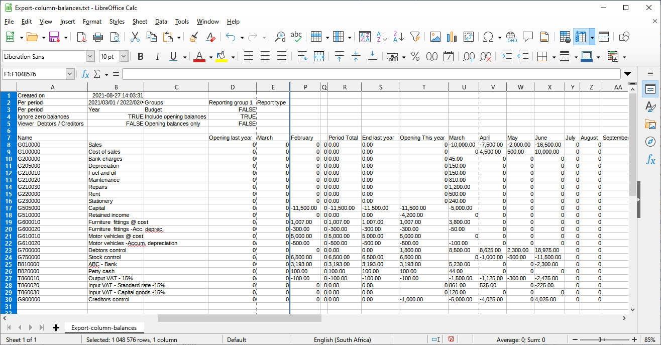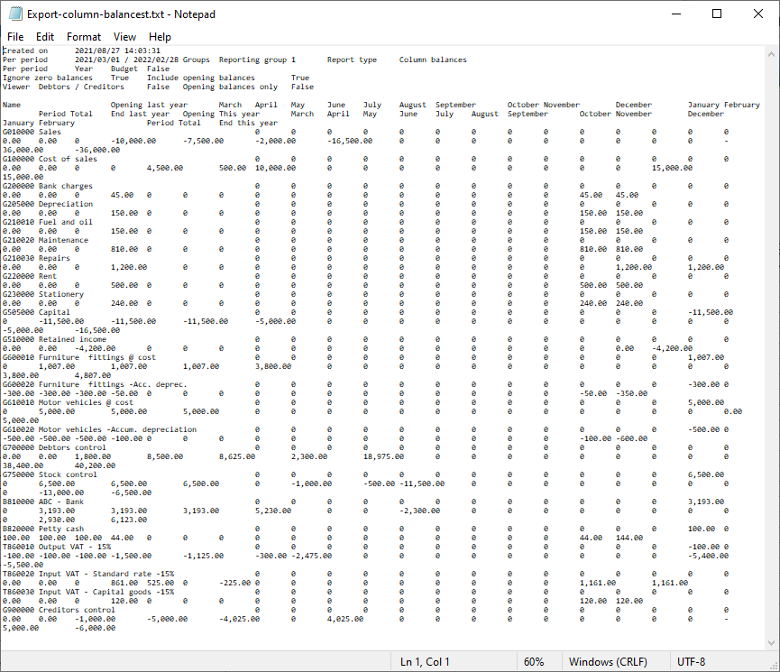 You may also generate the transactions in a spreadsheet format in the Column balances D/C report types on the T-Ledger analyser. These transaction totals may be exported to an "Export.txt file and opened in a spreadsheet. |