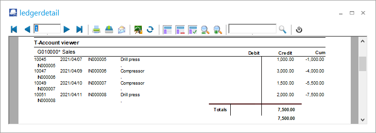 In this example,the T-Account-viewer is is launched by a double-click on April (This year) in the Sales account row: