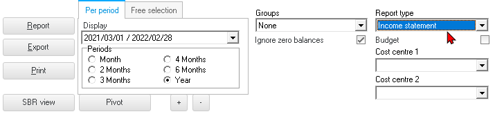 An example of the "Income statement - Reporting group 1" report type, in the "Ledger analyser" screen, is displayed as follows: