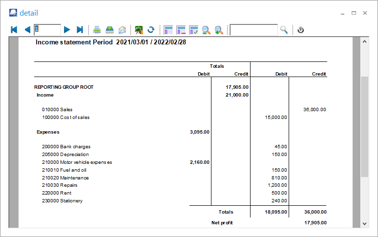 Click on the Print button. An example of the printed "Income statement - Reporting group 1", is displayed as follows: