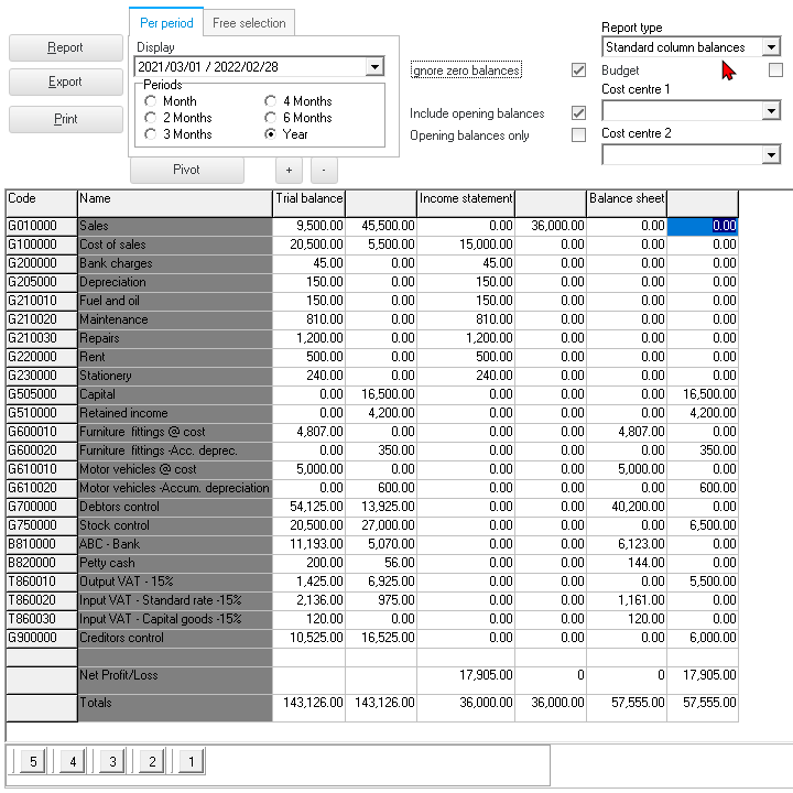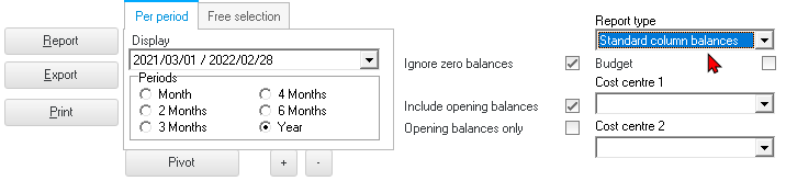 An example of the "Standard column balances" report type, in the "Ledger analyser" screen, is displayed as follows: