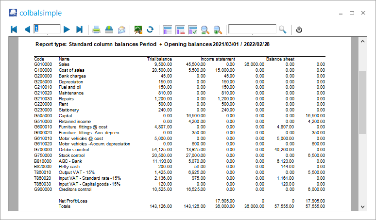 Click on the Print button. An example of the printed "Standard column balances" report, is displayed as follows: