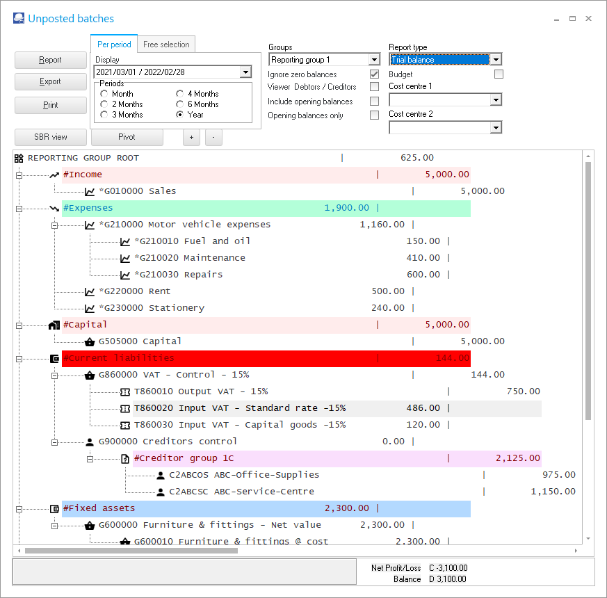 You may view, print and export a Trial balance, Income statement and Balance sheet for unposted as well as posted batches from the Batch entry (F2) context menu.