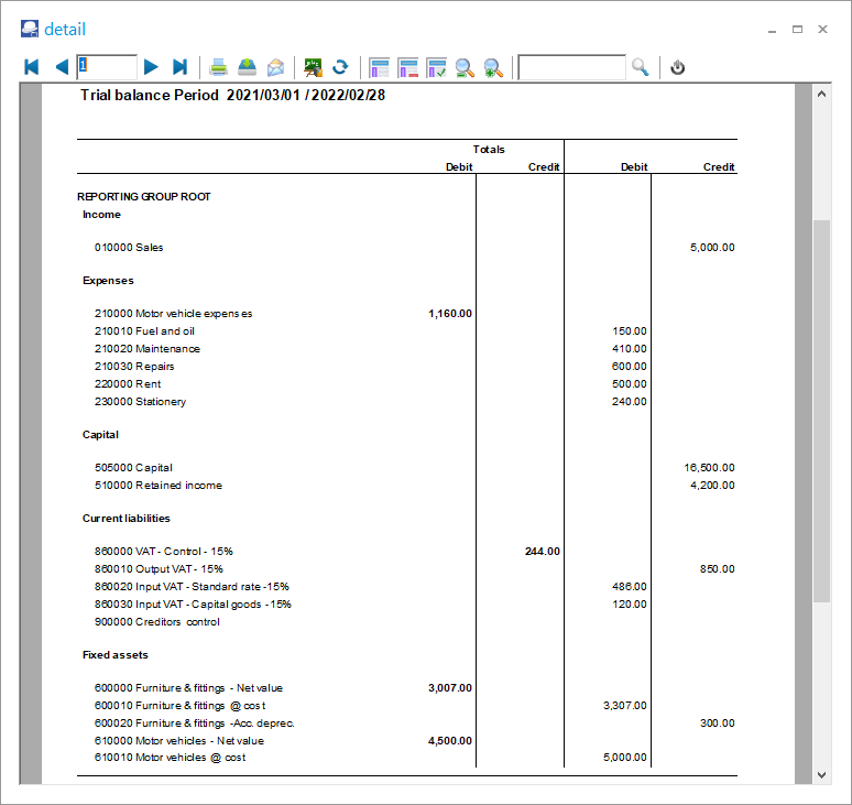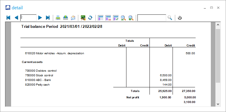 When this Trial balance is launched, the Print button will not be displayed. To initialise the Print button, select Income statement or Balance sheet and then Trial balance. |