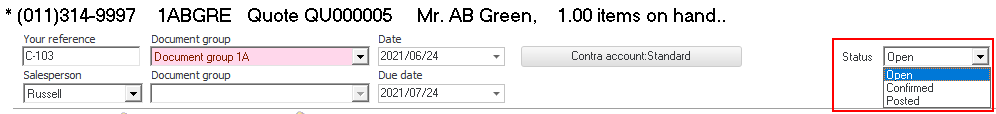 - Confirmed - The status for Quotes and Orders will may be filtered as Confirmed, Posted or Open, Document list screen. In the Document entry header of Quotes and Orders, the "Status" may also be changed.