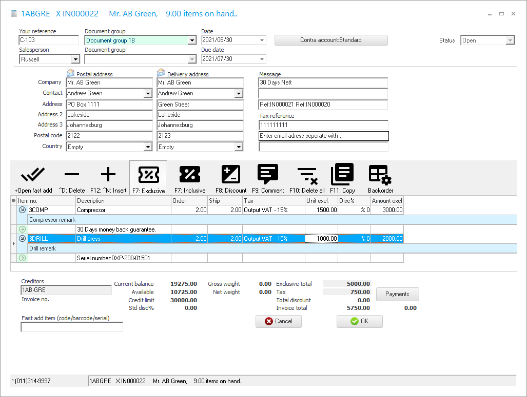 - Orders - You may need to place an Order with any of your creditors (suppliers / vendors). When the goods are received or services are provided, you may confirm the Order against the actual goods received and the original Order. You will do this by converting the Order to a Purchase document.