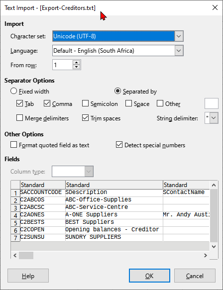 On your spreadsheet application, open the creditor (supplier / vendor) accounts saved text (*.txt) file and confirm your tab delimited settings on the "Text Import" screen.