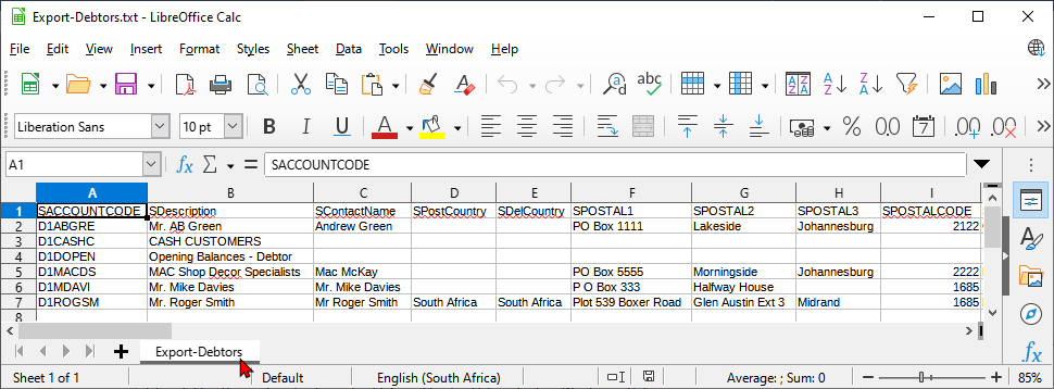 This will open your exported text file of the selected debtor (customer / client) accounts in a spreadsheet. An example of the exported file opened in "LibreOffice Calc" spreadsheet, is as follows: