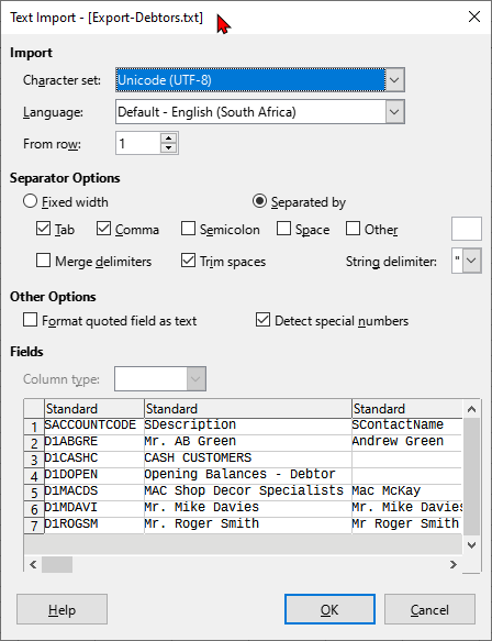 On your spreadsheet application, open the debtor (customer / client) accounts saved text (*.txt) file and confirm your tab delimited settings on the "Text Import" screen.