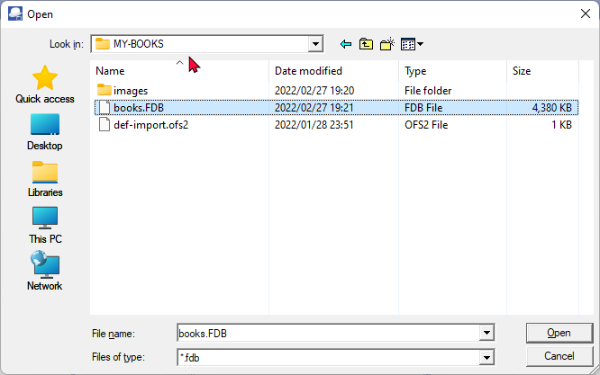 - If you click on the Add icon, and select the "Select Set of Books directory" option, the "Open" screen is displayed: