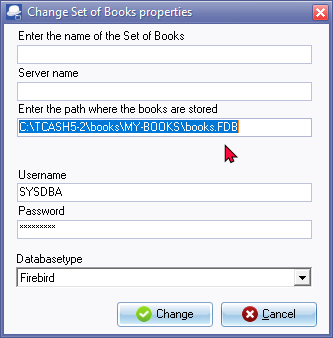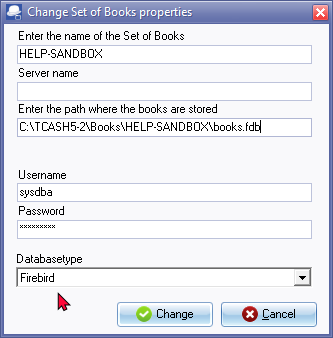 - Select a valid database (*.fdb - Firebird datbase) on your system and click on the Open button. The "Change Set of Books properties" screen is displayed: