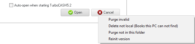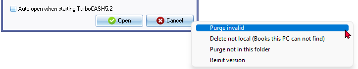 - Purge invalid - This option will remove invalid / non existing Sets of Books (in the Set of Books open screen listed in the Red - Font colour - This indicates that a Set of Books (elsewhere on your system) is deleted or the Set of Books folder is moved somewhere else on your system. It may also indicate that the drive or network on which the Set of Books is stored, is not available or mounted.
