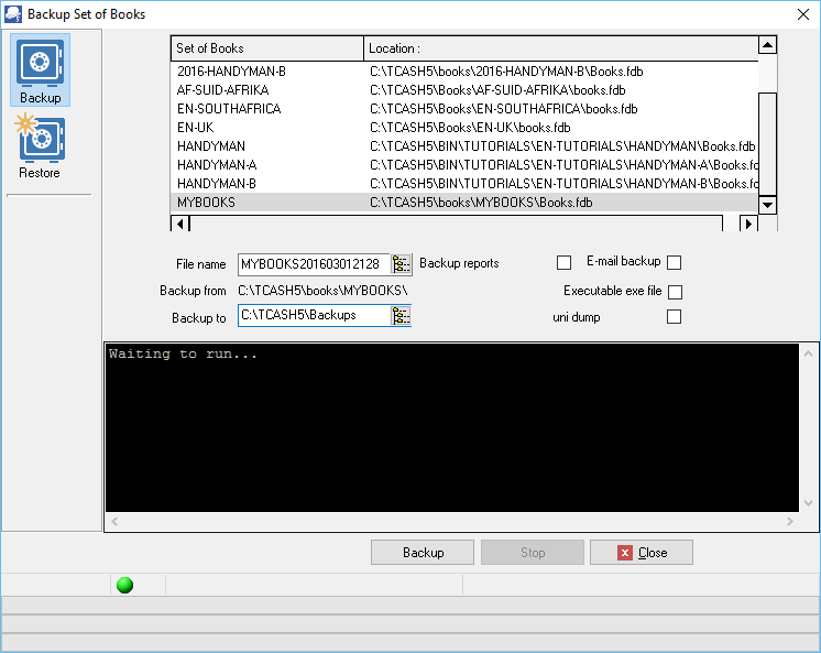 1.On the Start ribbon, select Backup / Restore. If a Set of Books is open on your system, TurboCASH will automatically close the Set of Books and the Backup Set of Books screen is displayed: