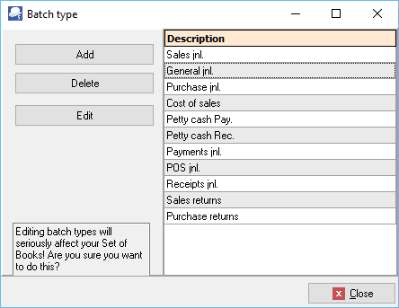 You can create any additional journals by adding them to this list. If you have more than one Bank account, you need to create a payments and receipts journal for each one. If you were initially short of journal types, you may enter additional journal types to accommodate your reporting requirements. These will not be retroactive, so thorough setting up is preferable.